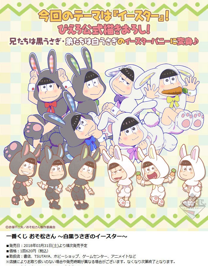 Uzivatel 一番くじ Bandai Spirits Na Twitteru 新企画 進行中 今回のテーマは イースター ぴえろ公式描きおろし 兄たちは黒うさぎ 弟たちは白うさぎのイースターバニーに変身 一番くじ おそ松さん 白黒うさぎのイースター 3 31 土 より順次