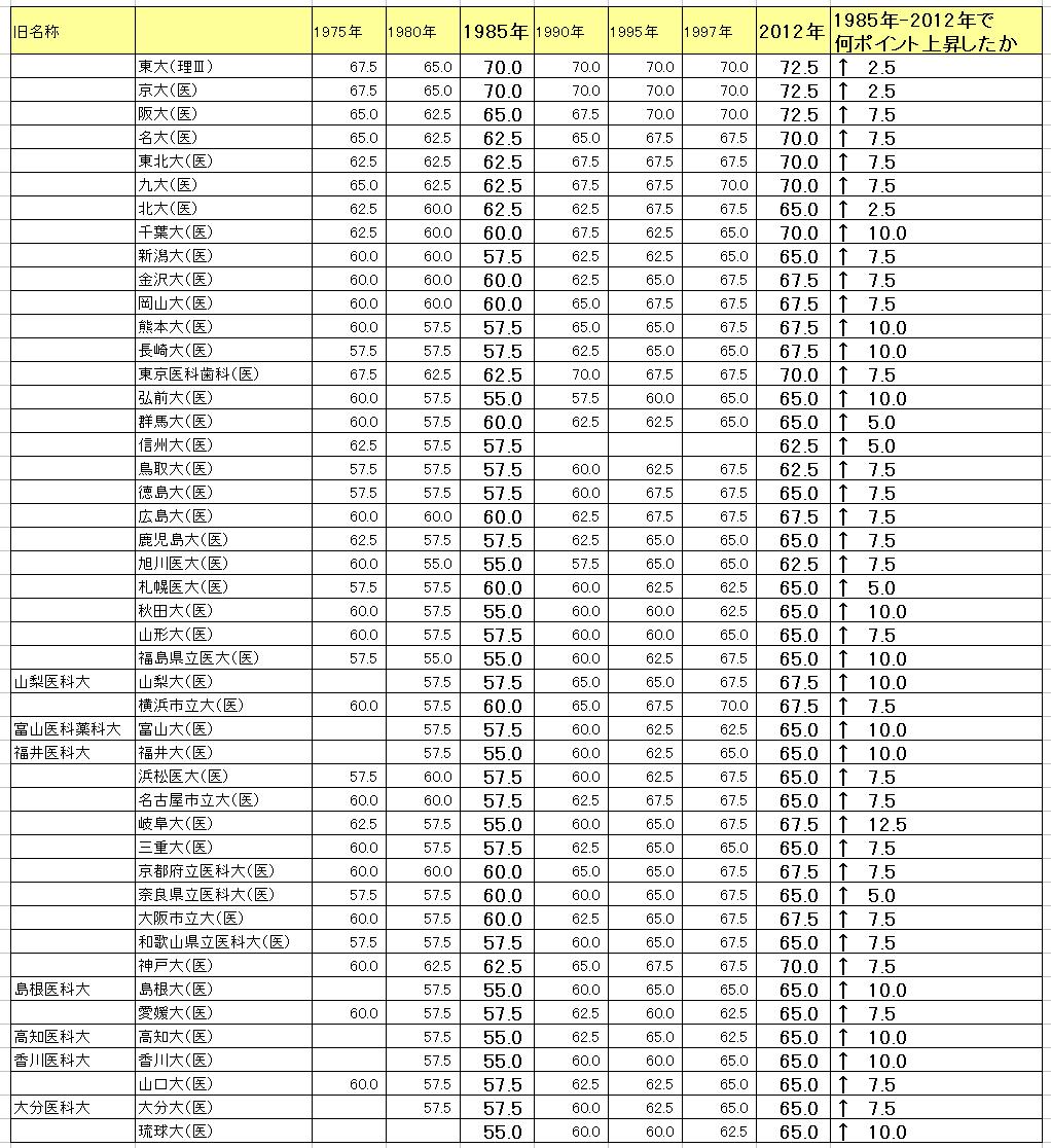 Aoki Lab 教育関連コラム 大学 医学部の偏差値推移 1985年と2012年比較 他