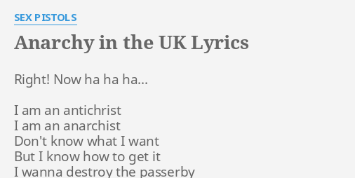 以下 歌詞カードに載っている英詞の全文である right now hahahahaha i am an antichrist i am an anarchist don t know what i want but i know how to get it i wanna destroy passer by cause i wanna be anarchy no dogsbody. Cause i wanna be anarchy anarchy for the u k. Anarchy in the u k. I thought it was the uk 歌詞大意.